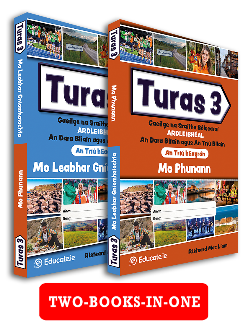 Turas 3 (3rd edition) Textbook + Mo Phunann/Mo Leabhar Gníomhaíochta "0 Ceachtanna úra bríomhara a spreagfaidh scoláirí chun foghlama. 0 Litríocht ón Liosta Téacsanna Ainmnithe clúdaithe ar bhealach cruthaitheach agus cuimsitheach. 0 Ábhair chomhaimseartha ón bhfíorshaol curtha i láthair ar bhealach soiléir agus spreagúil. 0 Téacsanna tarraingteacha a spreagfaidh scoláirí chun cainte. 0 Tascanna éisteachta agus scríbhneoireachta a thacóidh leis an bhfoghlaim. 0 Cur chuige struchtúrtha scafláilte i ngach ceacht. 0 Físcheachtanna nua le cuir i láthair shamplacha chun cabhrú le scoláirí ullmhú dá gcuid MRBanna. 0 Béim ar phríomhscileanna na Sraithe Sóisearaí – ag obair le daoine eile san áireamh – sna gníomhaíochtaí agus sna tascanna. 0 Béim ar an bhféinmheasúnú tar éis topaicí tábhachtacha chun cabhrú le scoláirí monatóireacht a dhéanamh ar a gcuid dul chun cinn. 0 Cleachtaí athbhreithnithe i rith agus ag deireadh gach caibidle. 0 Ceachtanna gramadaí suite i gcomhthéacs réadúil chomh maith le Treoir Ghramadaí atá éasca a thuiscint ar chúl an leabhair. 0 Míreanna cultúir a nascfaidh an pobal teanga leis an seomra ranga agus a chabhróidh leis an scoláire na scileanna cuí a fhorbairt do na Measúnuithe Rangbhunaithe. 0 Réimse leathan cleachtaí scríbhneoireachta sa chaibidil ‘An Mhír Scríbhneoireachta’." Turas 3 3rd editon ebook Turas 3 (3rd edition) ebook only 2 years
